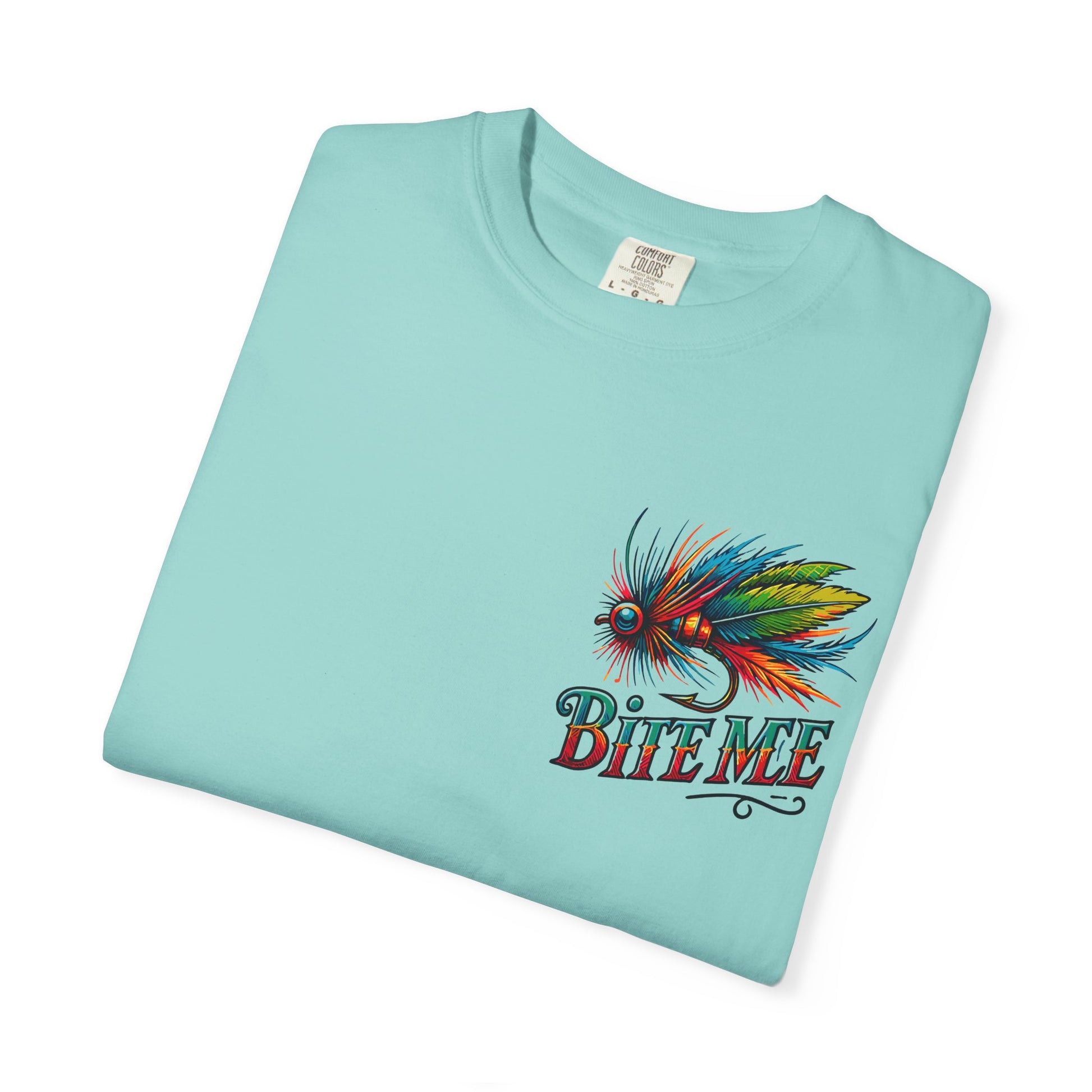 Throw some shade and reel in the laughs with this colorful Bite Me Fishing Tee. Featuring a vibrant fly fishing lure and bold, cheeky lettering, this design is perfect for anglers with attitude and outdoor lovers who don’t hold back.