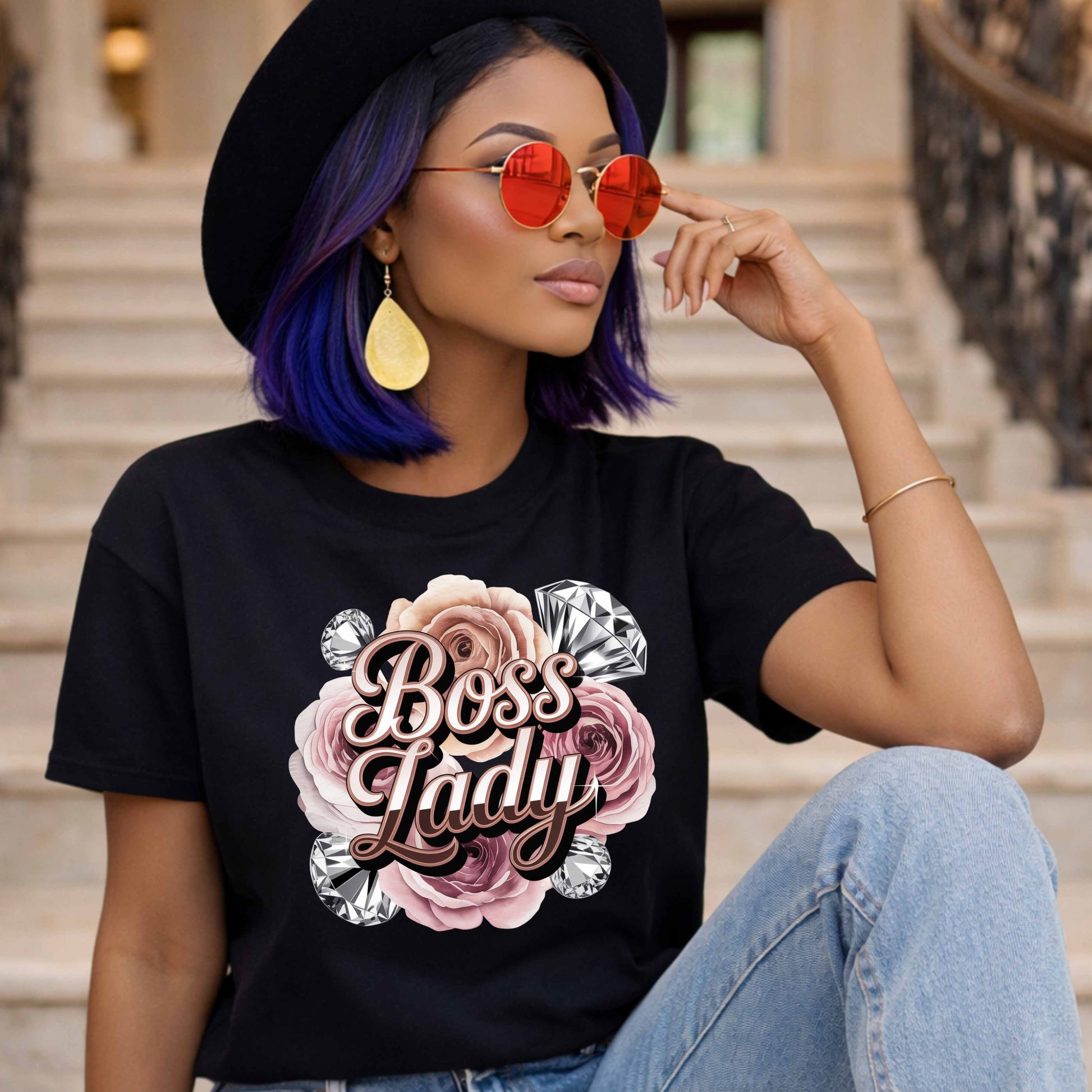Soft, confident, and a little bit glamorous — this tee says you lead with style. Lightweight cotton holds a detailed print of blooming roses and sparkling gems behind a vintage-script “Boss Lady,” so the message feels feminine and unapologetic. Wear it to morning meetings with a blazer draped over the shoulders, to a casual networking brunch, or at home while planning your next bold move. The relaxed crew silhouette moves with you; the tear-away label and ribbed collar keep comfort front and center. It’s for women who run their days on intention and a touch of sparkle.