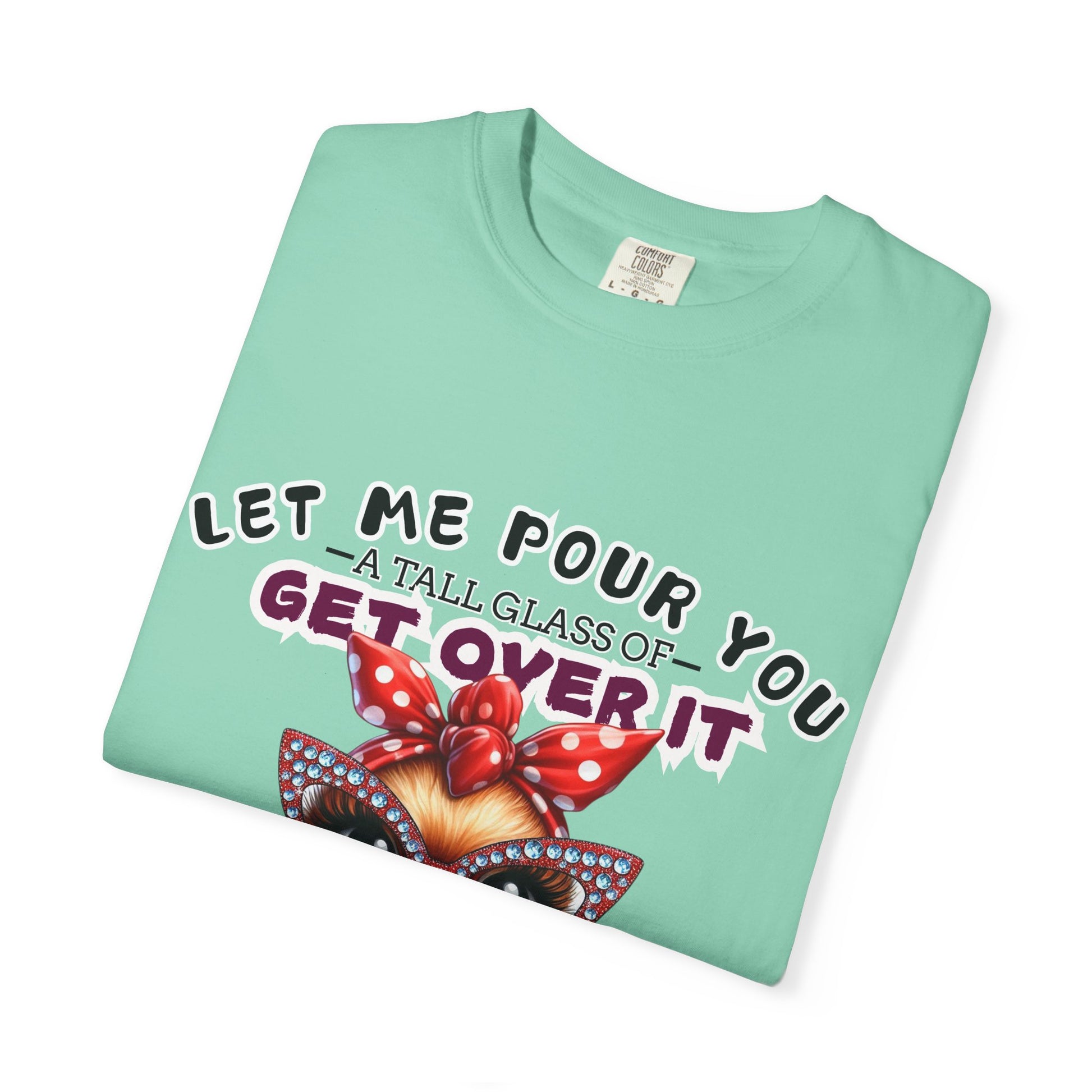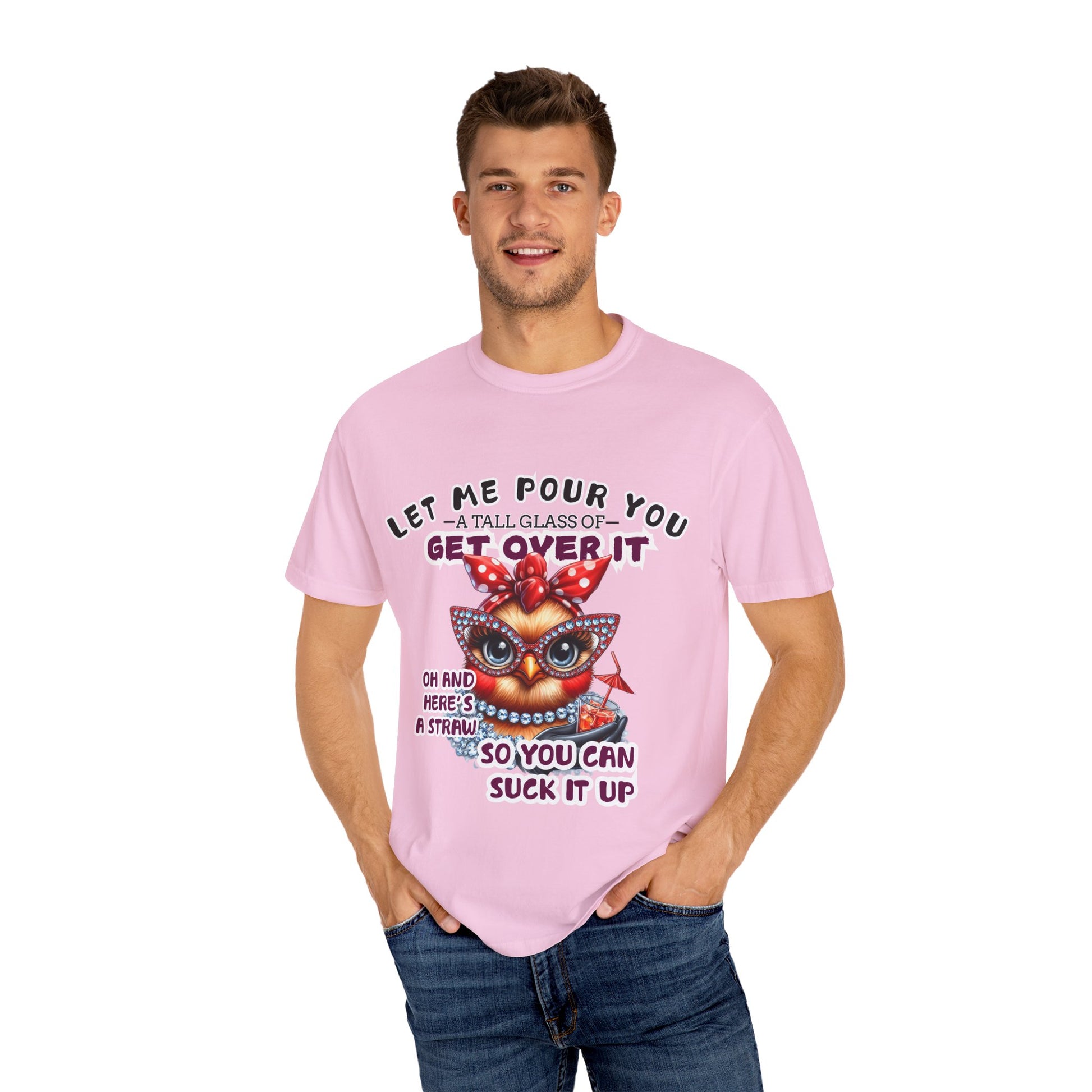 Funny Unisex Comfort Colors T-Shirt with a "Get Over It" Chicken Design, perfect for those who appreciate humor and comfort in their clothing. This t-shirt is great for casual wear and can be easily paired with jeans or shorts. Ideal for adults who enjoy quirky and light-hearted designs. Suitable for holidays, birthdays, or any casual outing.