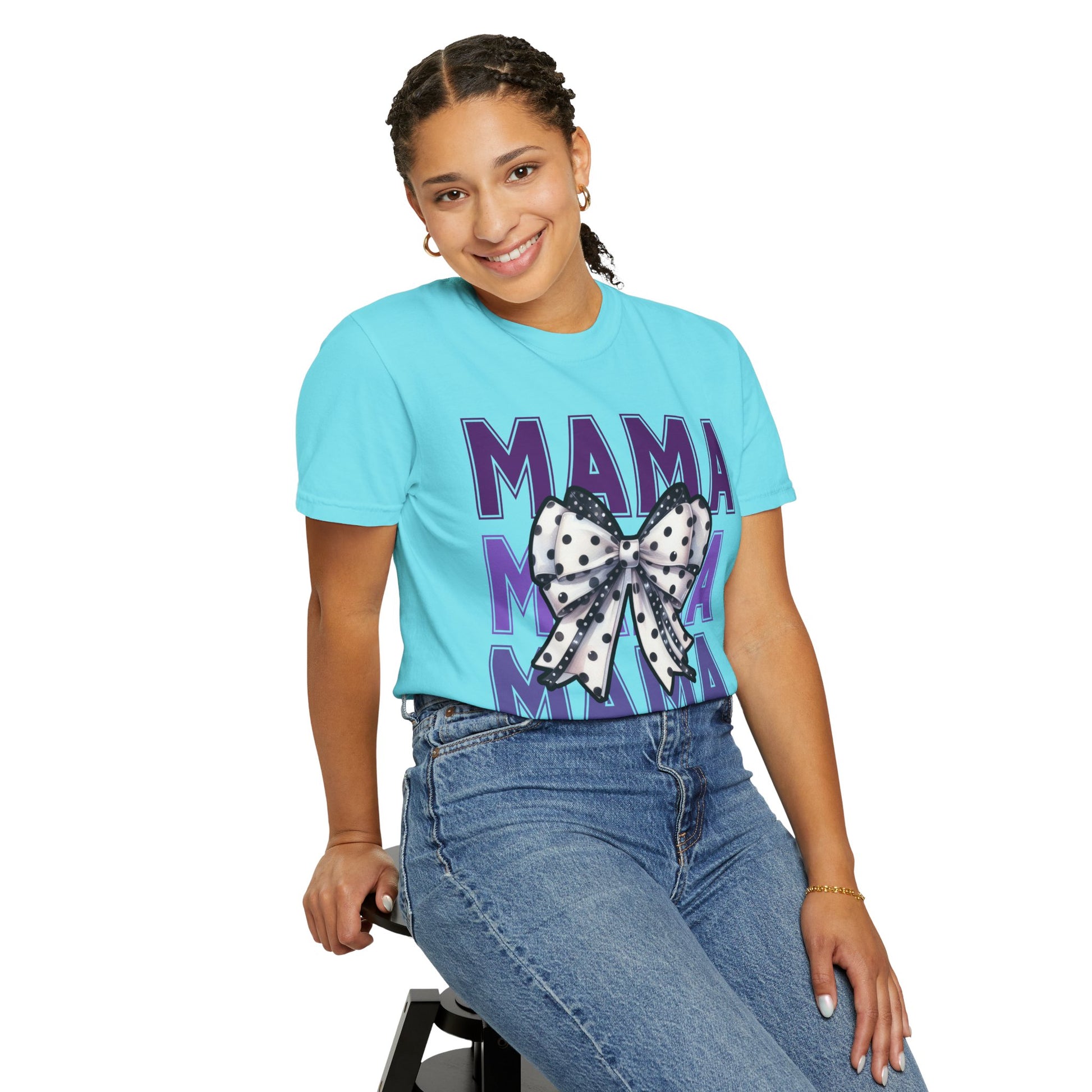 The mama bow T-shirt exudes a cozy and casual vibe, perfect for everyday wear or lounging around the house. This garment is relevant to moms, mother figures, and anyone looking for a cute and comfortable tee to celebrate motherhood. Ideal for Mother's Day, birthdays, or simply as a thoughtful gift.