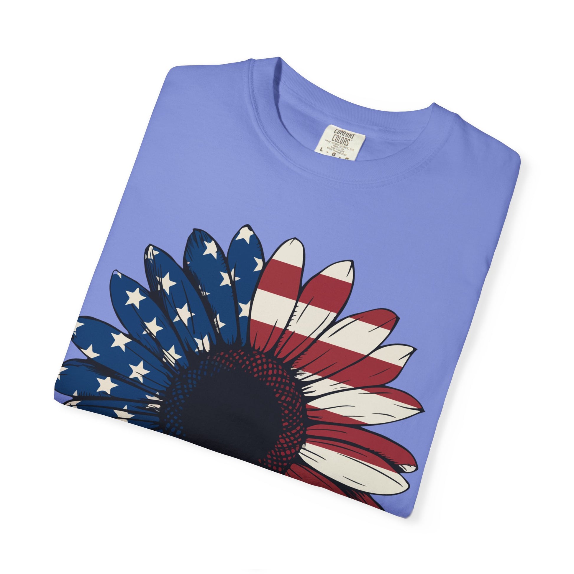 Patriotic Sun Flower Comfort ColorsT-Shirt, USA Flag Tee, Unisex Graphic T-Shirt for Independence Day, Summer Picnic, Gift for Americans