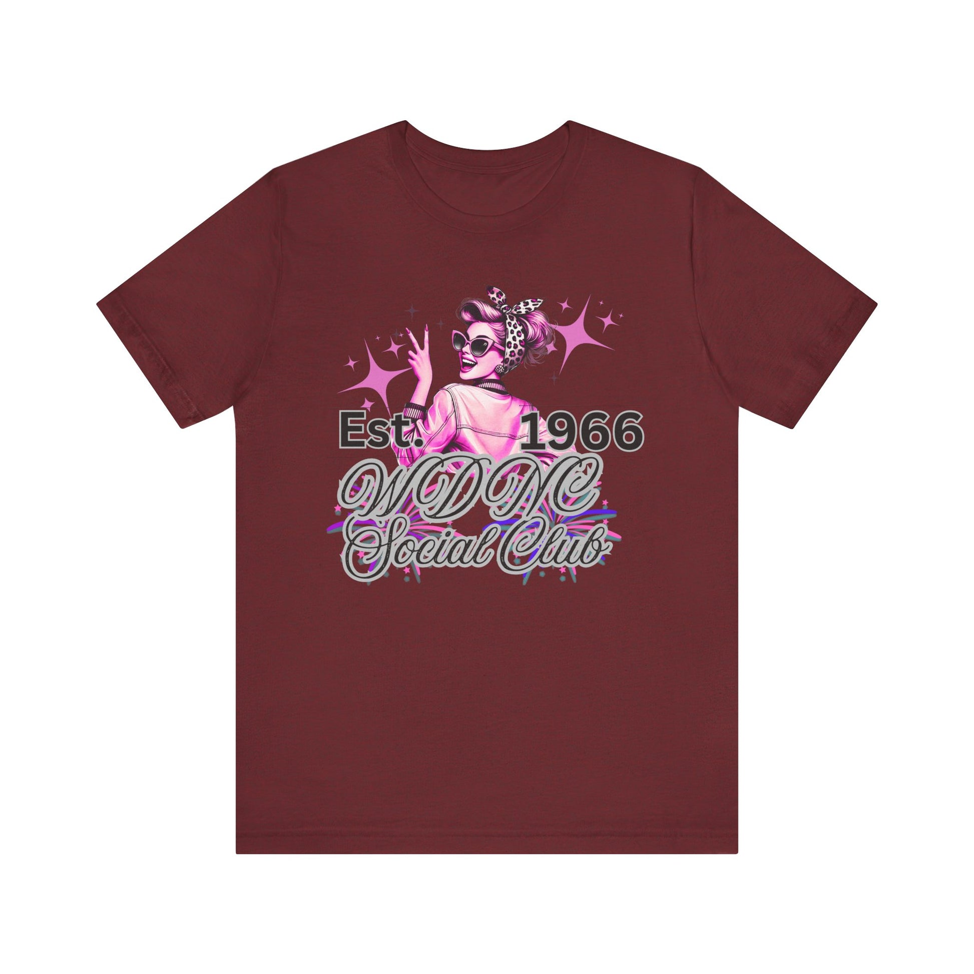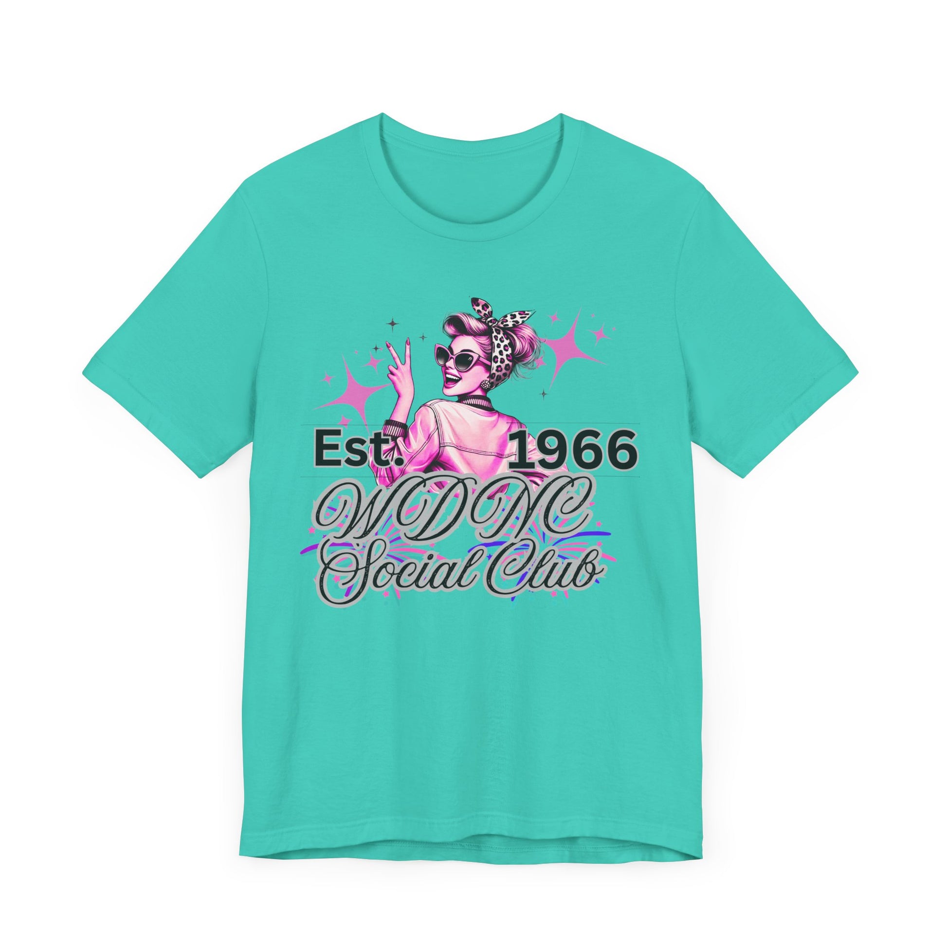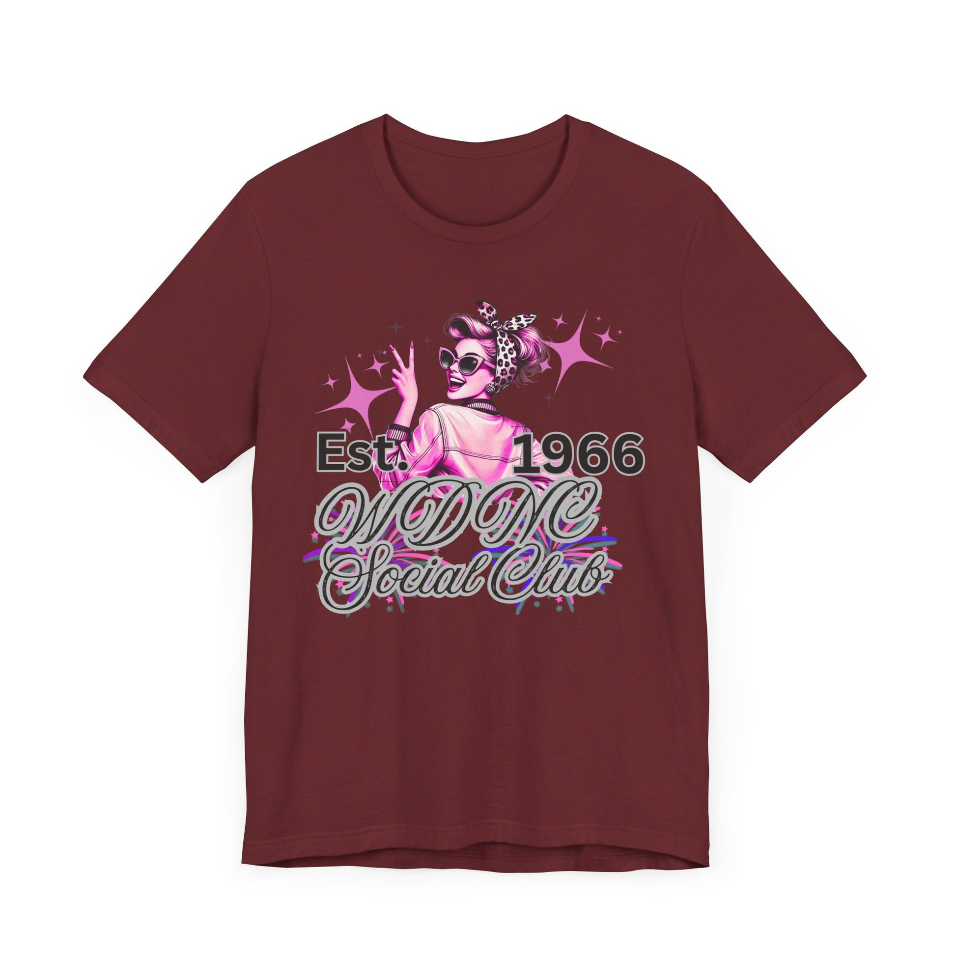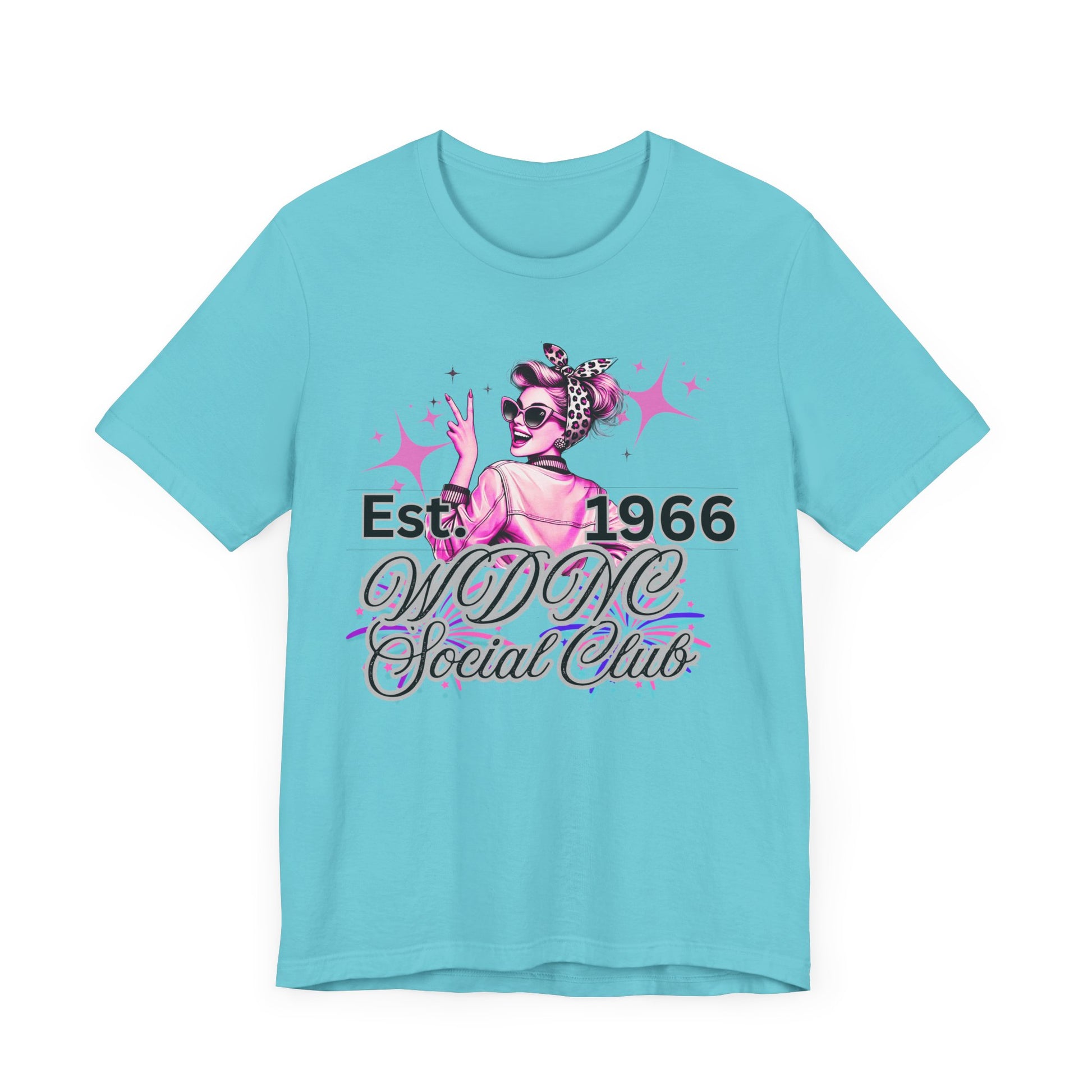 Celebrate the fierce, fabulous, and forever iconic vibes of the WDNC Social Club with this retro-inspired graphic tee! Featuring a bold pin-up-style diva in pink, rocking her polka-dot headband and attitude, this shirt is a shoutout to sisterhood, sparkle, and style since 1966. With vibrant throwback colors, dazzling starbursts, and vintage flair, it's the perfect top for club members, social queens, or anyone who loves a blast from the past with modern sass. Wear it loud, proud, and pretty in pink!
